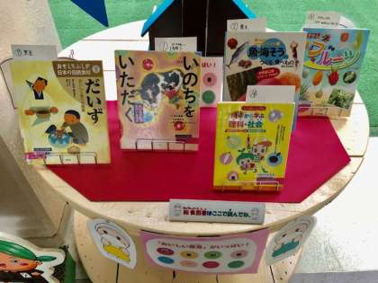 玄関ホールには、今週の給食図書を展示しています。その給食図書は給食終了後、玄関の給食図書コーナーに展示しています。それぞれの給食図書は、学校ホームページの「本日の給食献立」でも紹介しています。