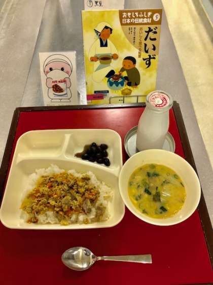 上段の写真は、本日の献立と給食図書です。本日の給食図書は「おもしろふしぎ日本の伝統食材 だいず」でした。だいずを使ったいろいろな食べ方が載っている図書でした。