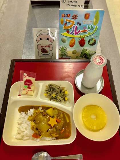 本日の献立は「ポークカレーライス・ごぼうサラダ・パインアップル(缶)・牛乳」でした。