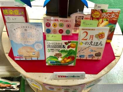 玄関ホールには、今週の給食図書を展示しています。その給食図書は給食終了後、玄関の給食図書コーナーに展示しています。それぞれの給食図書は、学校ホームページの「本日の給食献立」でも紹介しています。