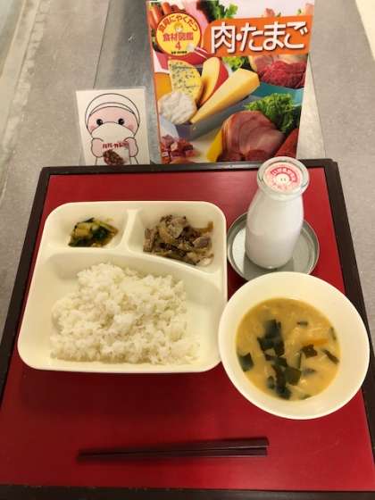 上段の写真は、今日の献立と給食図書です。今日の給食図書は「食育にやくだつ食材図鑑 肉・たまご」でした。豚や牛や鶏卵等、色々な種類の肉やたまごが載っている図鑑でした。