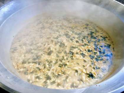 下段の写真は、みそ汁を煮ているところです。