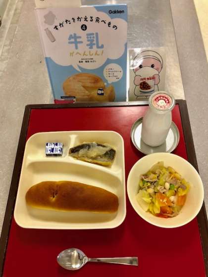 上段の写真は、今日の献立と給食図書です。今日の給食図書は「すがたをかえるたべもの 牛乳がへんしん!」でした。バターやチーズ等、牛乳が色々な食べものに加工される事が載っている図書でした。