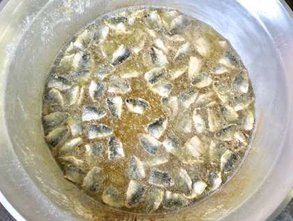 下段の写真は、マリネのあじを揚げている様子です。
