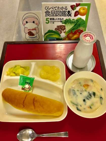 上段の写真は、今日の献立と給食図書です。今日の給食図書は「くらべてわかる食品図鑑」でした。「ほうれん草とこまつな」や「なしと洋なし」等の違いがわかる図鑑でした。