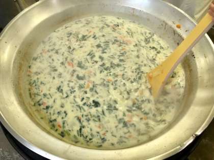 ほうれん草のクリームシチューは、鶏肉、にんじん、じゃがいも、ほうれん草等が入ったホワイトチューでした。味の決め手は給食室で作る手作りのホワイトルウです。焦げないように弱火で炒めます。