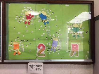 2月に入って、エレベーター横の掲示板には、3年生の子どもたちが節分にちなんで作った掲示物が貼られています。かわいい鬼といっしょに、牛乳キャップの裏に子どもたちの笑顔の絵で豆が表されています。