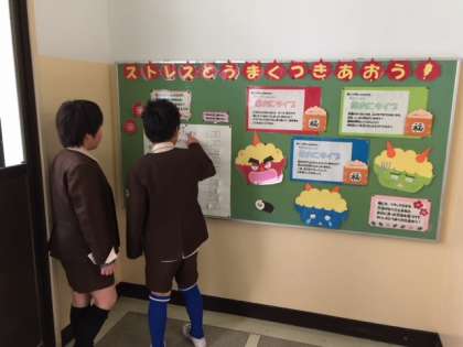 保健室の横には「ストレスとうまくつきあおう」というテーマの掲示物が貼られています。子どもたちはクイズに答えて、あなたはどの鬼のタイプ?や、ストレス解決のアドバイスを熱心に見ています。