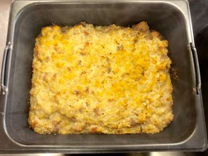 下段の写真は、焼きあがった押し麦のグラタンです。