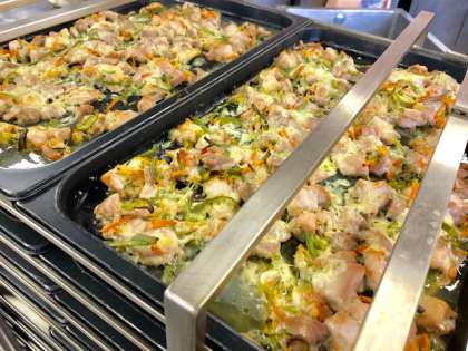 下段の写真は、焼きあがった鶏肉とチーズのカラフル焼きです。