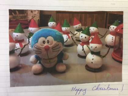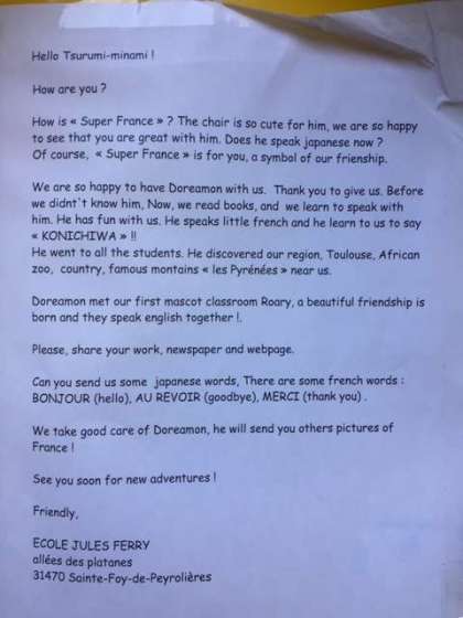 前にフランスから「スーパー・フランス」という人形が送られてきて、学校の中や遠足先に人形を連れて行って撮った写真を送り返し、同時にドラえもんの人形を贈ったところ、お返しに写真を撮ってくださったということです。