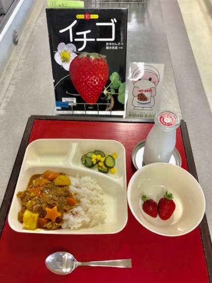 上段の写真は、本日の献立と給食図書です。本日の給食図書は「もっと知りたい イチゴ」でした。いちごの各部位の説明や育て方が載った図書でした。