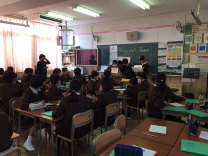 レッスンでは、初めに「ももたろう(ピーチボーイ)」を英語で学習し、そこで習った英語のフレーズを使って、オリジナルのお話を考え、紙芝居の形式で発表しました。