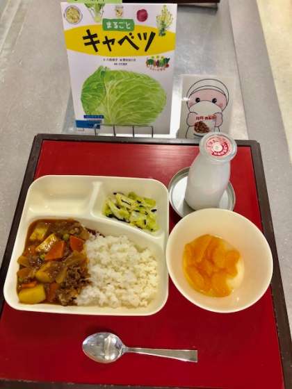 上段の写真は、本日の献立と給食図書です。本日の給食図書は「まるごとキャベツ」でした。キャベツの栄養素や美味しい食べ方等が載っている図書でした。