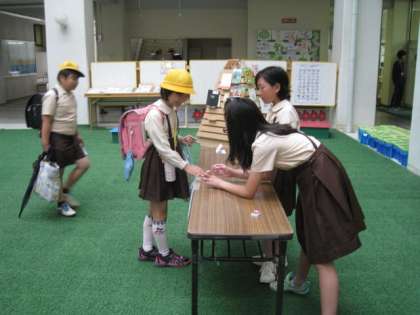 さらに今回は児童会のアイデアで、全児童に「あいさつカード」が配付され、毎朝あいさつができたらスタンプを押してもらい、これが全部貯まったら「君もあいさつレンジャーだ」ということになっています。