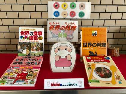 食育図書は1ヶ月ごとにテーマを変えて、玄関ホールに設置しています。このコーナーを利用して、食べること(給食)や読むこと(図書)に、より一層興味をもってくれるといいですね。