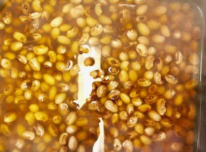 下段の写真は、出来上がったばかりのとら豆の煮ものです。