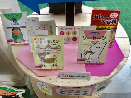 玄関ホールには、今週の給食図書を展示しています。その給食図書は給食終了後、玄関の給食図書コーナーに展示しています。それぞれの給食図書は、学校ホームページの「本日の給食献立」でも紹介しています。