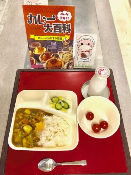 上段の写真は、本日の献立と給食図書です。本日の給食図書は「カレー大百科」でした。世界のさまざまなカレーの紹介やその歴史が載っている図書でした。