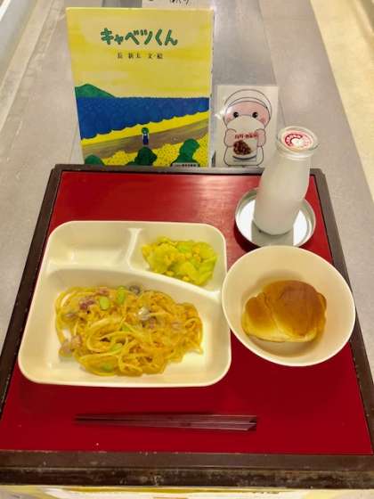 上段の写真は、本日の献立と給食図書です。本日の給食図書は「キャベツくん」でした。キャベツくんとブタヤマさんの珍妙なやりとりが楽しい絵本でした。