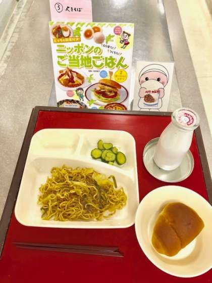 上段の写真は、本日の献立と給食図書です。本日の給食図書は「ニッポンのご当地ごはん」でした。神戸のそばめしや、沖縄のソーミンチャンプルー等、全国各地のご当地ごはんが載っている図書でした。