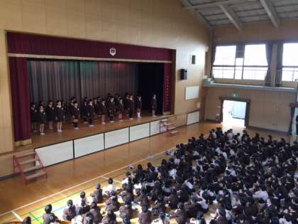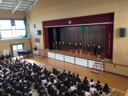 朝の児童集会では、児童会前期の運営委員、代表委員があいさつをしました。初めに運営委員が舞台に並んで「笑顔があふれる鶴見南小学校にしていきたいと思います」等と決意を表明していきました。次に代表委員が舞台に上がって、「より良い学校にするため、進んで意見を発表していきたいと思います。」等と述べました。高学年の堂々とした姿を見て、他学年の子どもたちもしっかり聞いていました。