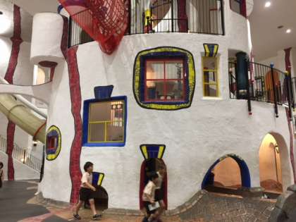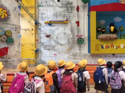 地下鉄、JR環状線と乗り継いでキッズプラザに着くと、子どもたちの目は「ピタゴラスイッチ」のような仕掛けに釘付けになりました。館内の回り方の約束を聞いた後、子どもたちはグループに分かれて出発しました。大きなすべり台や、キッズマート等、いろいろな遊具や活動を楽しく回りました。