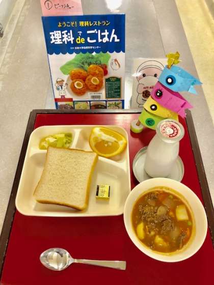 上段の写真は、本日の献立と給食図書です。本日の給食図書は「理科deごはん」でした。シチューのお肉を柔らかくする方法やてんぷらをさくさくに揚げる方法が科学的に説明されている図書でした。