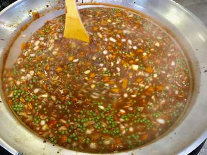 ビーフシチューは、牛肉、にんじん、たまねぎ、じゃがいも等が入った自家製ブラウンルウを使用したシチューでした。ブラウンルウは小麦粉を中火で炒めて作ります。