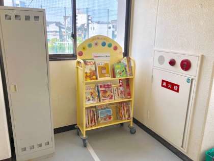 移動式給食図書コーナーは、2階の西階段の前へ移動しました。