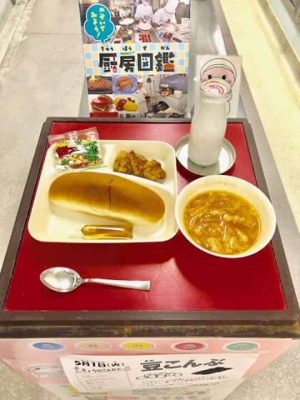 上段の写真は、本日の献立と給食図書です。本日の給食図書は「厨房図鑑」でした。トンカツ屋さんやケーキ屋さん、回転寿司屋さん等の厨房の中の様子が載っている図書でした。