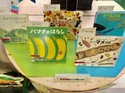 玄関ホールには、今週の給食図書を展示しています。その給食図書は給食終了後、玄関の給食図書コーナーに展示しています。それぞれの給食図書は、学校ホームページの「本日の給食献立」でも紹介しています。