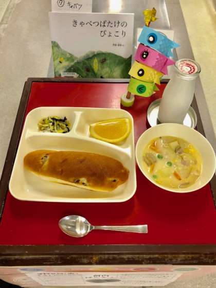 上段の写真は、本日の献立と給食図書です。本日の給食図書は「きゃべつばたけのぴょこり」でした。モンシロチョウのサナギがきゃべつ畑で孵化する様子を描いている絵本でした。