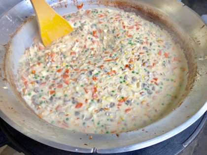下段の写真は、コーンクリームシチューを煮込んでいるところです。じっくりと煮込むことでとろみが出ます。