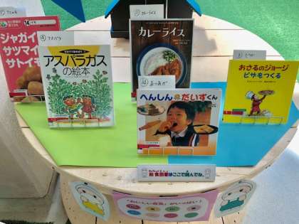 玄関ホールには、今週の給食図書を展示しています。その給食図書は給食終了後、玄関の給食図書コーナーに展示しています。それぞれの給食図書は、学校ホームページの「本日の給食献立」でも紹介しています。