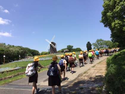 本校は児童数が多いので、1,2組が9時に学校を出発して先に見学し、3,4組は11時に学校を出発して、先に鶴見緑地でお弁当を食べました。お昼にお弁当を食べる所で合流し、1,2組は学校へ、3,4組は工場へ向かいました。