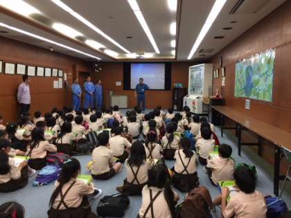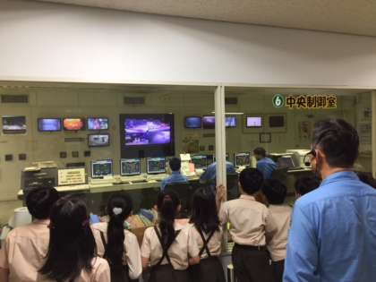 工場では、初めにごみ処理のしかたについてビデオを見て、次にグループに分かれて工場を見学しました。4年生の子どもたちは、大量のごみをクレーンがすくい取る様子に驚いたり、高さ100mの煙突を見上げたりしていました。見学後の質問コ−ナーでも、工場の人に熱心に質問していました。