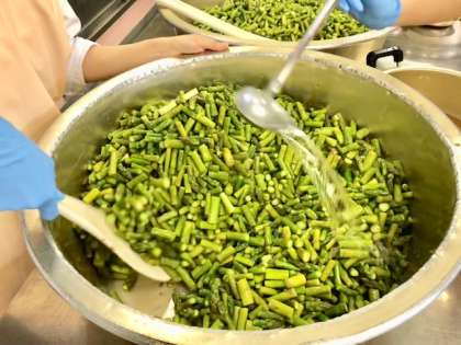 中段の写真は、グリーンアスパラガスのサラダを仕上げているところです。