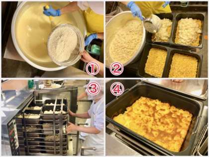 下段の写真は、クラフティの作る工程です。1:生地の材料となる鶏卵や砂糖、クリーム等を合わせています。2:ひとクラスずつコーンフレークを敷いたミニバットに生地を流し入れていきます。3:焼き物機で210度、15分間蒸し焼きにします。4:焼きあがったクラフティです。