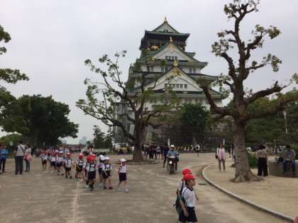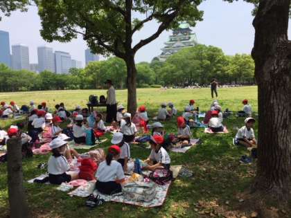 1年生は、春の遠足で大阪城公園に行きました。地下鉄の大阪ビジネスパーク駅で降りて、天守閣に向かっていくと、1年生の子どもたちは「おおさかじょう、大きいなー」とびっくりしていました。外国からの観光客でいっぱいの天守閣を抜けて、西の丸庭園に着くと、緑の芝生が一面に広がっていて、子どもたちは大喜び。お弁当をおいしく食べたり、おやつを楽しんだり、友だちと走り回って遊んだりしました。