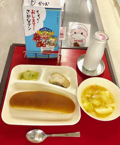 上段の写真は、本日の献立と給食図書です。本日の給食図書は「ぎょぎょぎょ!おしえて!さかなクン」でした。魚類学者のさかなクンがカツオやタイ、フグ等についての様々な知識をわかりやすく解説している図書でした。