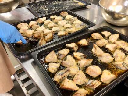 下段の写真は、焼き上がったかつおのガーリックマヨネーズ焼きです。にんにくとマヨネーズの焼けた香ばしい香りがしていました。