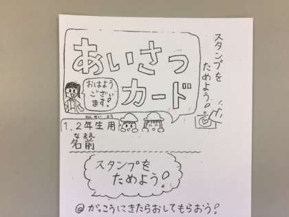 言われた子どもたちも元気にあいさつして、グリーンマットの所で「あいさつカード」にスタンプを押してもらいます。