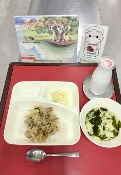 写真は、献立の見本と給食図書です。給食図書は「田んぼのきもち」でした。田んぼが作られた時から現代までの移り変わりが描かれている絵本でした。