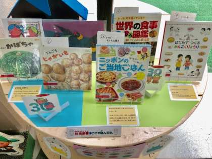 玄関ホールの給食図書コーナーに展示しています。それぞれの給食図書は、学校ホームページの「本日の給食献立」でも紹介しています。