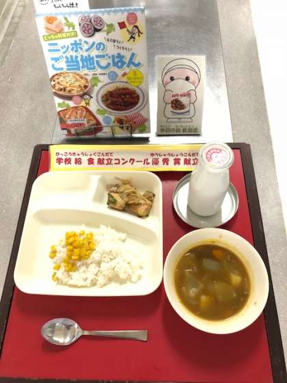 本日の献立は平成29年度の献立コンクール優秀賞作品「さけのちゃんちゃん焼き・とうもろこしごはん・スープカレー・牛乳」でした。北海道の食べものを給食で味わえるように考えた献立です。
