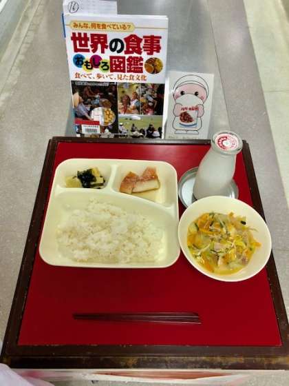 上段の写真は、本日の献立と給食図書です。本日の給食図書は「世界の食事おもしろ図鑑」でした。世界各国の料理や食材が、写真付きで紹介されている図書でした。