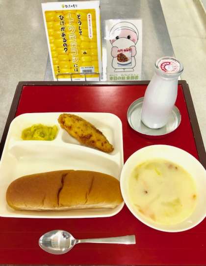 上段の写真は、本日の献立と給食図書です。本日の給食図書は「どうしてトウモロコシにはひげがあるの?」でした。「トウモロコシのひげがある理由」をはじめ、「トウガラシの辛い訳」や「ラッカセイはどこになる?」等、色々な野菜の不思議を楽しく解説している図書でした。