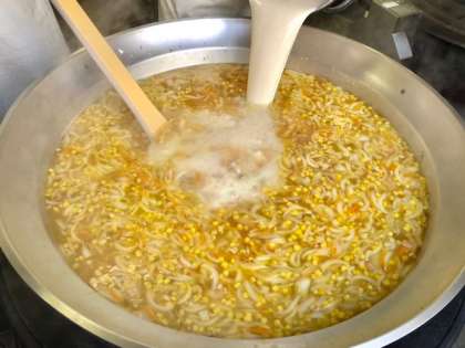 下段の写真は、コーンスープに豆乳を流し入れているところです。