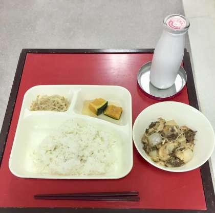 本日の献立は「鶏肉の甘辛焼き・みそ汁・キャベツの赤じそあえ・ごはん・牛乳」です。本日の献立も楽しみにしていてくださいね。